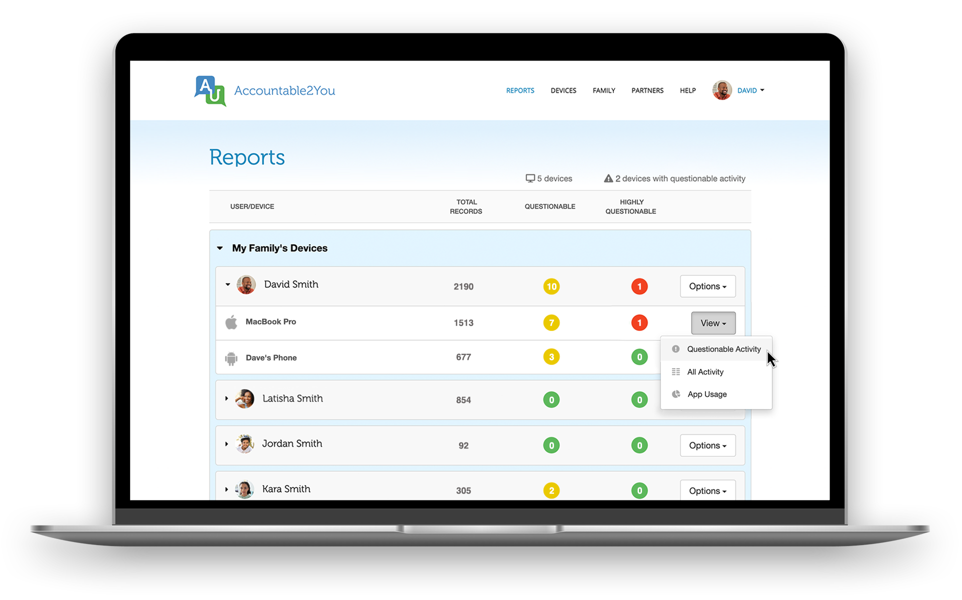 Maintain privacy by choosing who receives reports for each device and whether they can see all activity or alerts only.